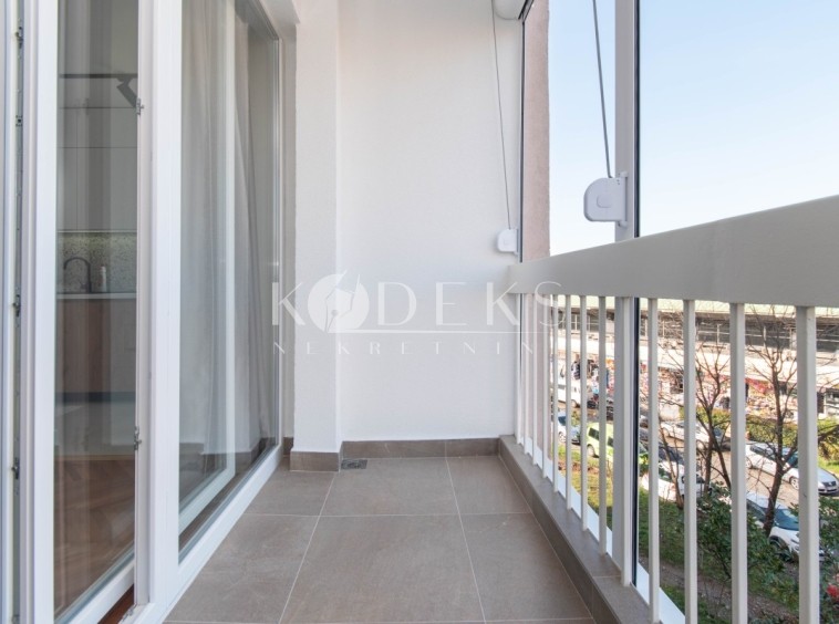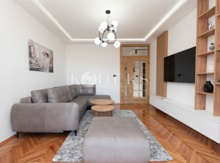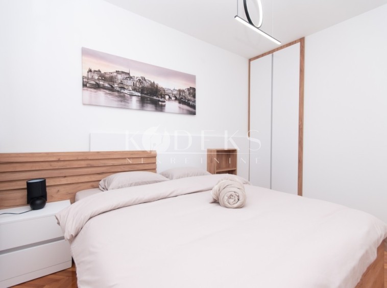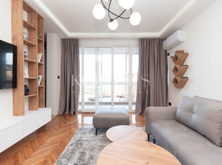 A luxuriously furnished two-bedroom apartment is for rent located on the second floor of a skyscraper near the Gintaš Shopping Center (Mall of Montenegro).