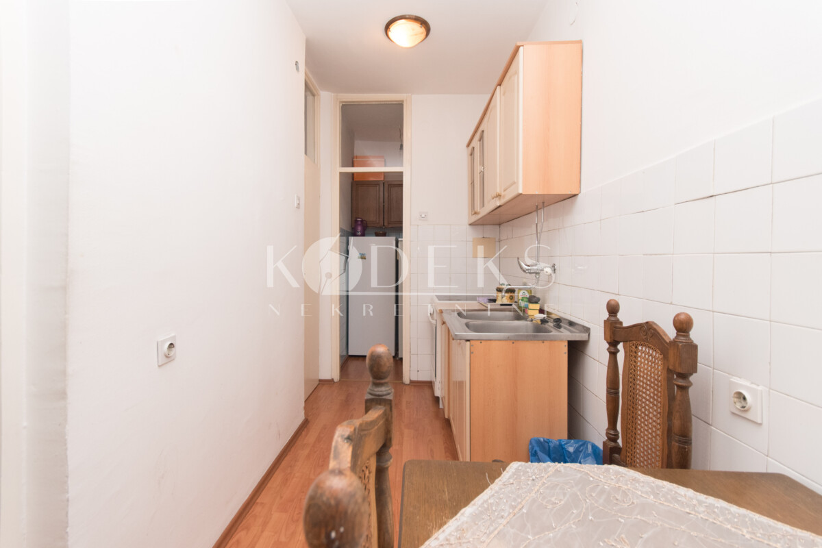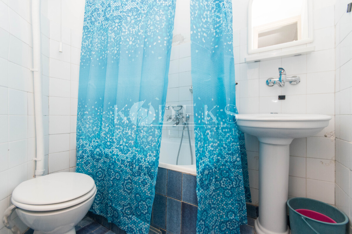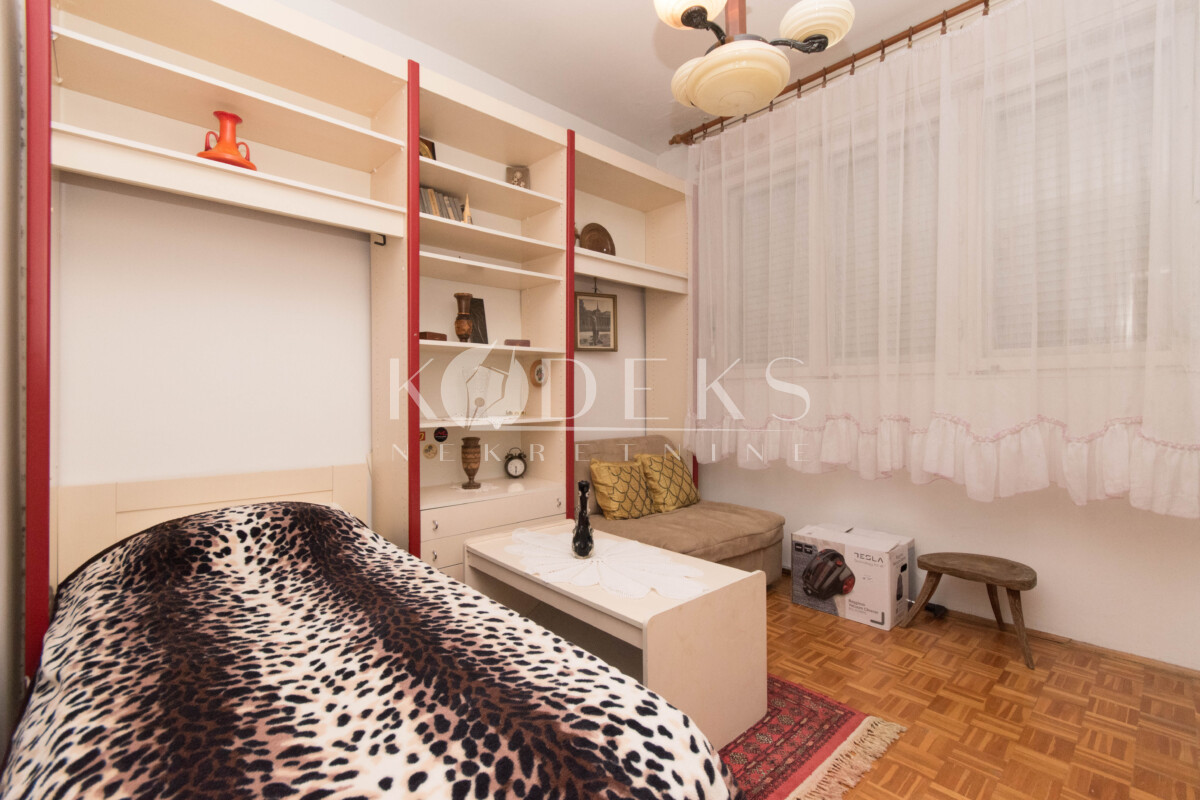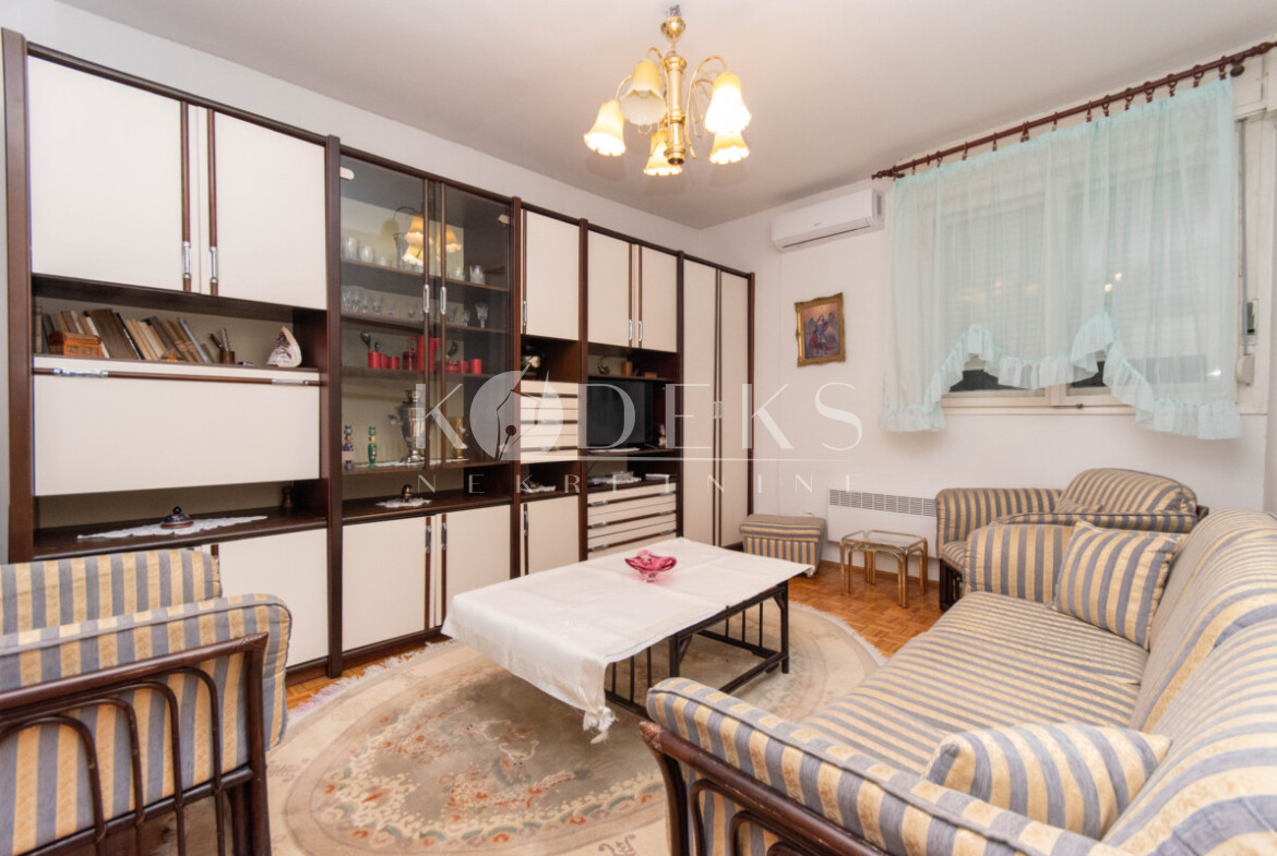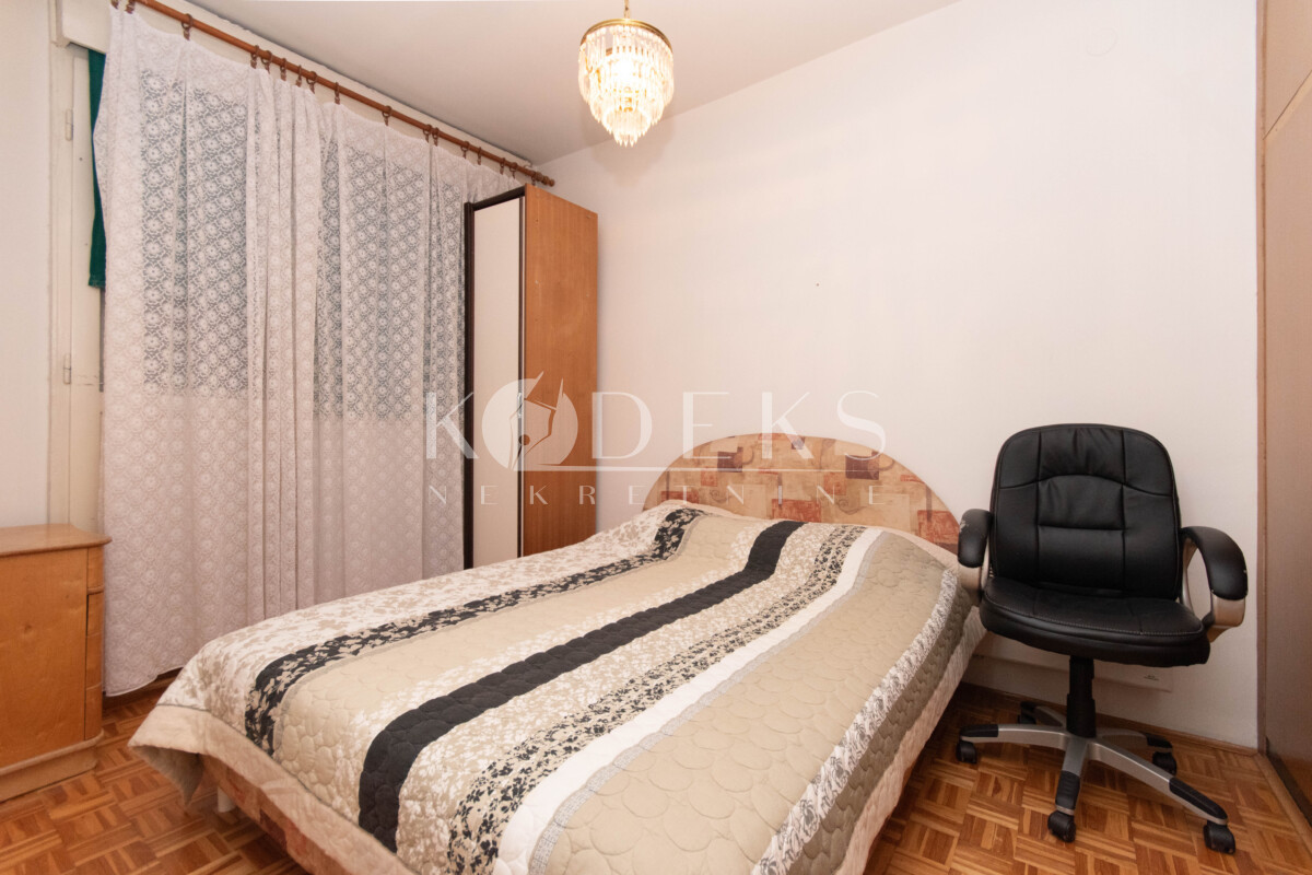 A furnished two-bedroom apartment is for rent located on the ninth floor (not the last) of a skyscraper in the Momišići neighborhood.