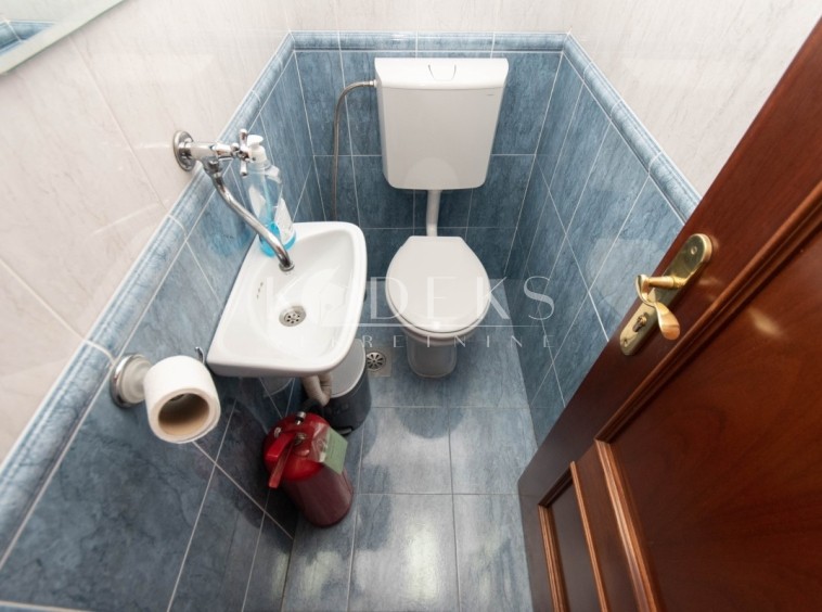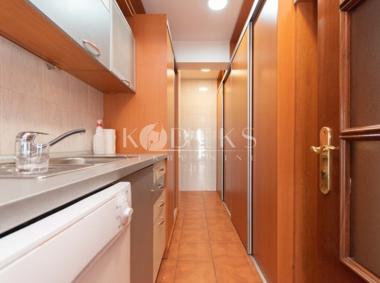 It is ideal for office activities due to the large number of built-in closets with several smaller shelves, the entire kitchen, except for a small part, is filled with smaller shelves suitable for binders and similar office materials.