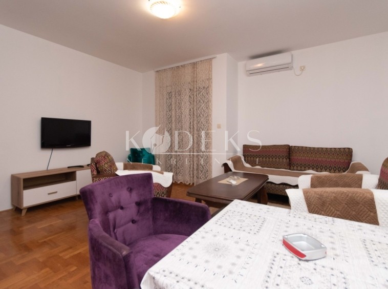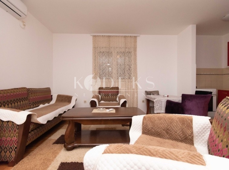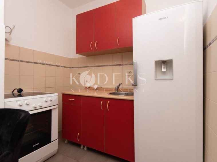 A furnished one-room apartment is for rent located on the ground floor of a smaller residential building in Momišići, across the street from the Palestine embassy.