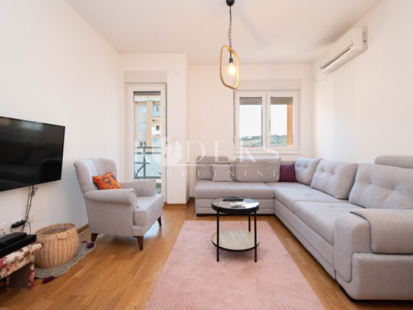 A fully furnished two-bedroom apartment for sale located on the third floor of the Bemax building at Stari aerodrom.