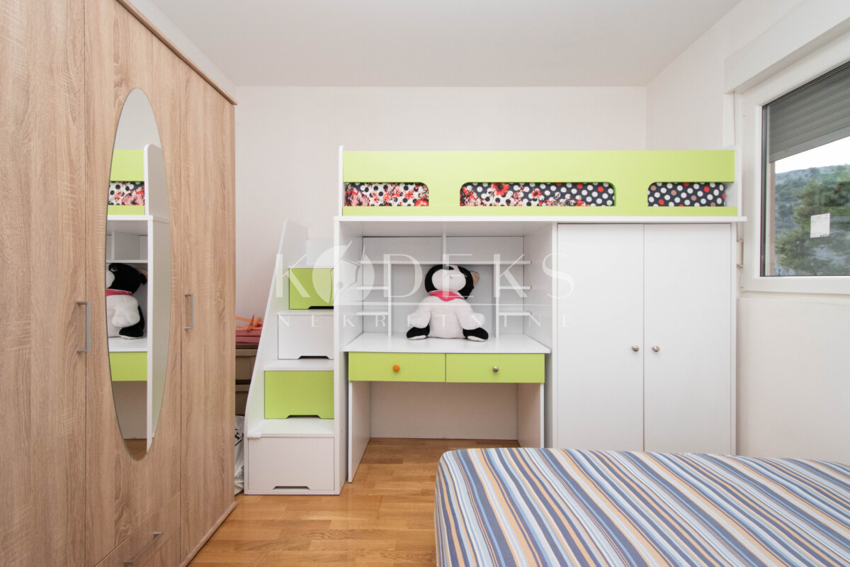 Struktura: Dnevna soba sa izlazom na terasu, trpezarija i kuhinja otvorenog tipa, dvije spavaće sobe, ulazni hodnik, kupatilo i toalet.