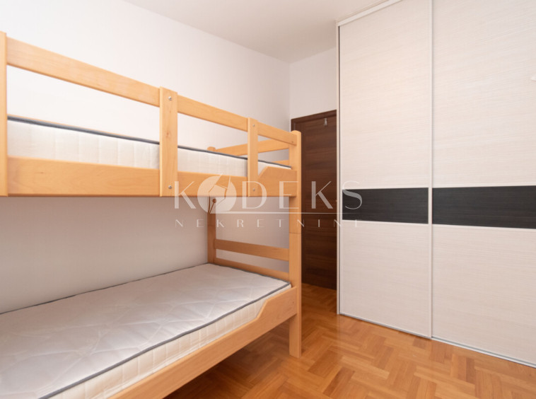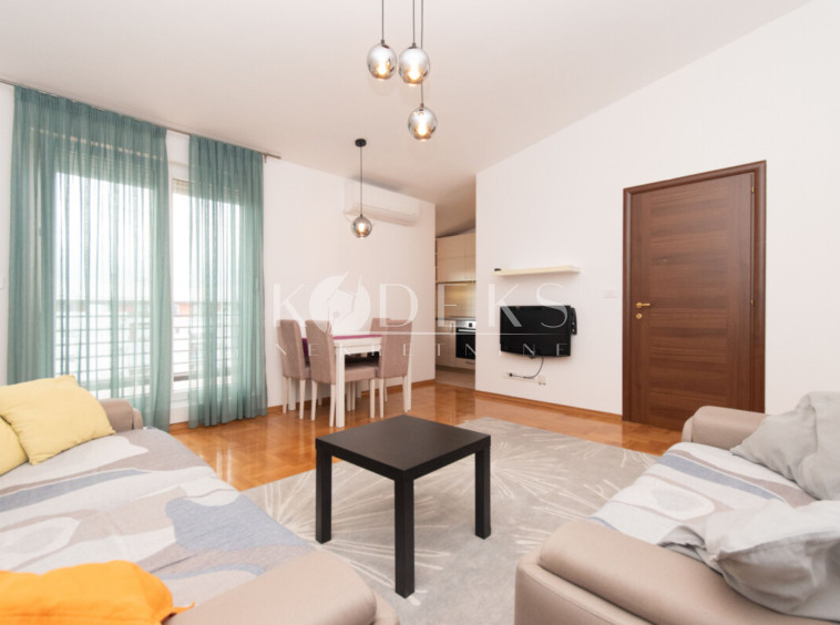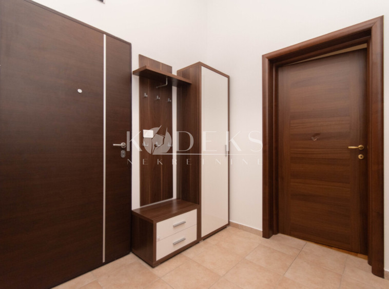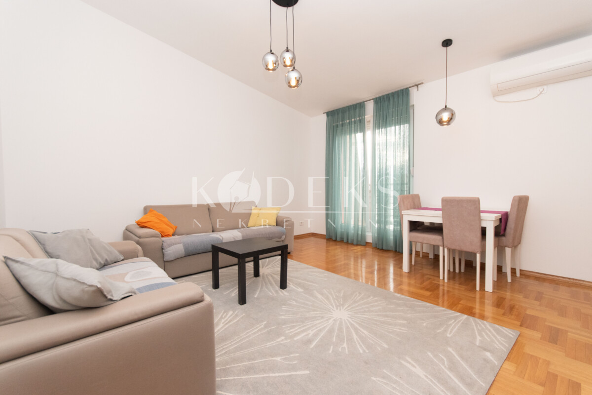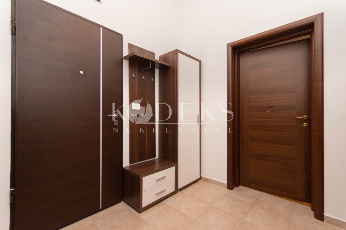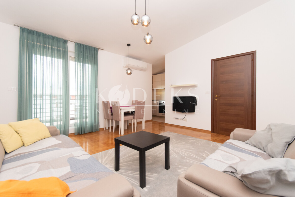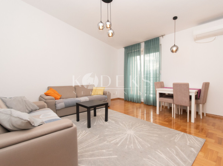 Struktura: Dnevna soba koja je povezana sa kuhinjom i trpezarijom i ima izlaz na veoma komfornu terasu, dvije spavaće sobe, ulazni hodnik, predsoblje, kupatilo i toalet.