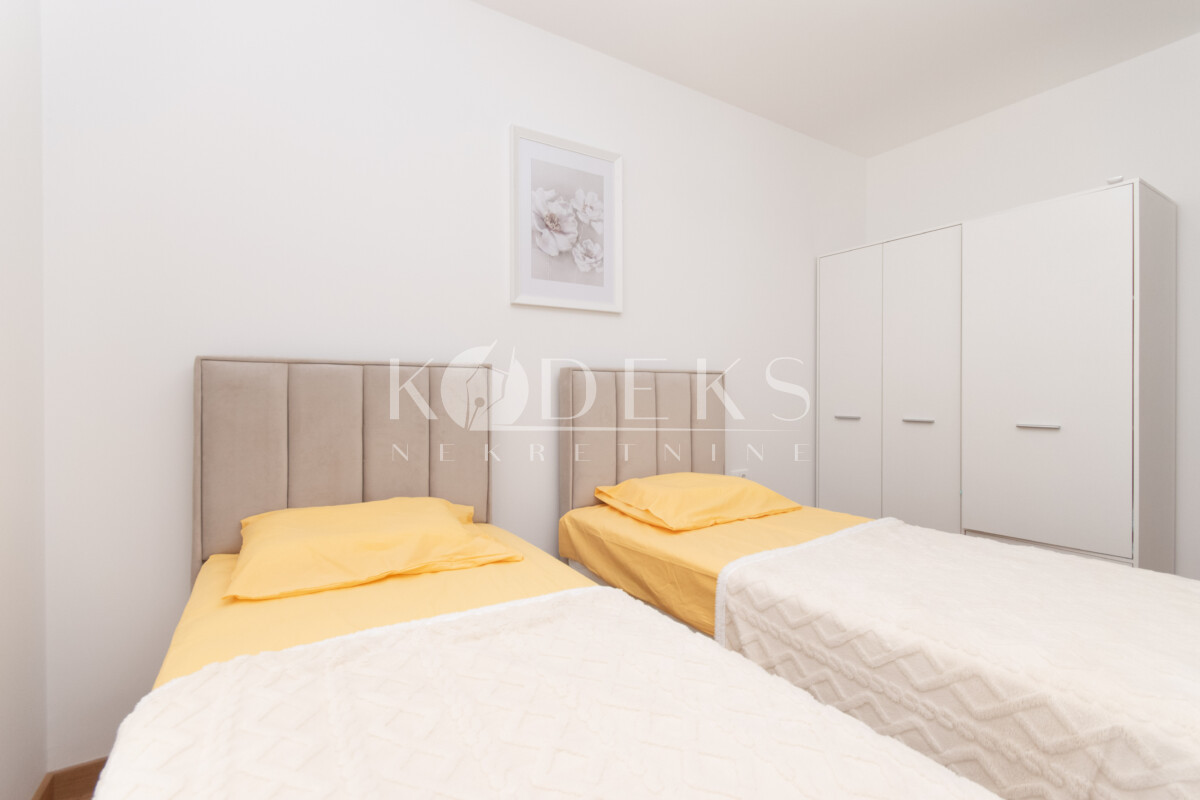 Struktura: Dnevna soba sa trpezarijom i kuhinjom otvorenog tipa i koja ima izlaz na terasu, dvije spavaće sobe koje takođe imaju izlaz na terasu, ulazni hodnik, kupatilo i toalet.