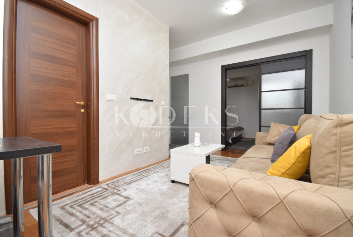 Izdaje se lijepo opremljen jednosoban stan smješten na četvrtom spratu stambene zgrade u Siti kvartu.